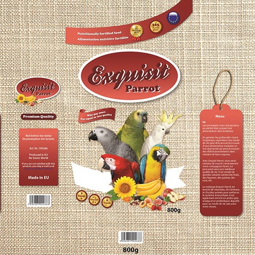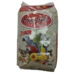Сончоглед шарен, бел сончоглед, сончоглед црн, пченка, шарени крокети од житарки и зеленчук (цвекло), рогач, кернели од кикирики, шафран, овесно семе, јачмен, пченица, кикиритки, бело семе од тиква, оризово семе, банани, кајсии, Суво грозје, леќа, снегулки од грав, снегулки од грашок, брашно од ориз, јачмен снегулки, пченкарни снегулки, папаја, ананас, лимета, чили пипер